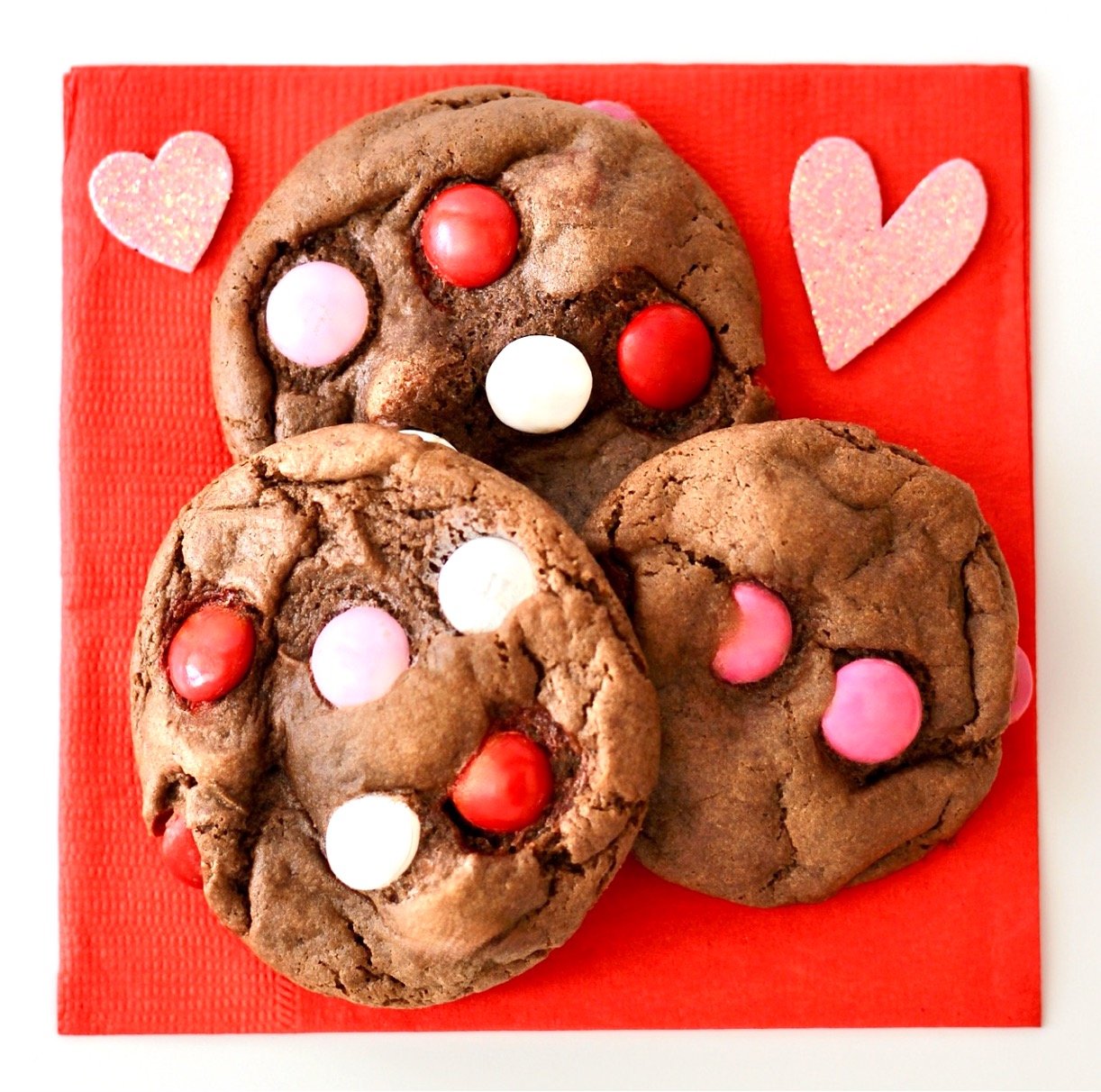 The way I see it, if you’re going to add something amazing to your chocolate cookies, why not get a little exuberant about the matter! Especially when gorgeous Valentine’s Day M&M’s are involved!!