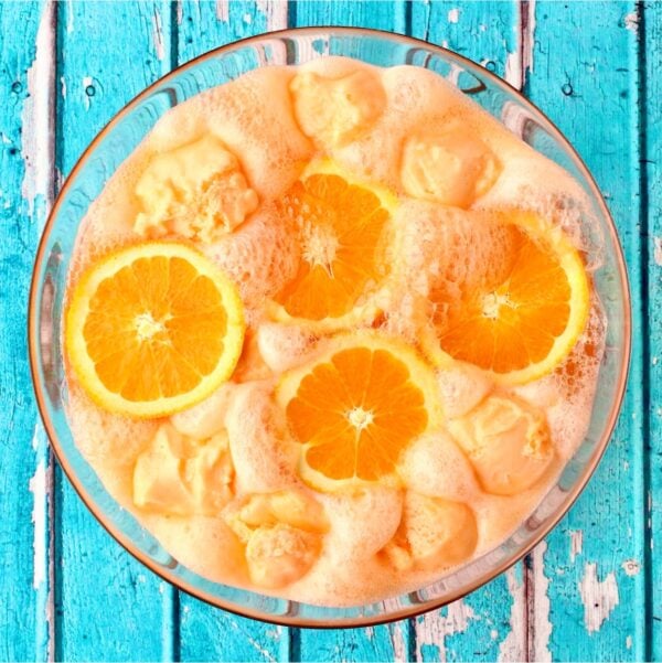 The secret is the Orange Sherbet. It adds an irresistible creamy Orange Creamsicle swirl kind of flavor to the punch, while giving that ridiculously fun frothing effect!