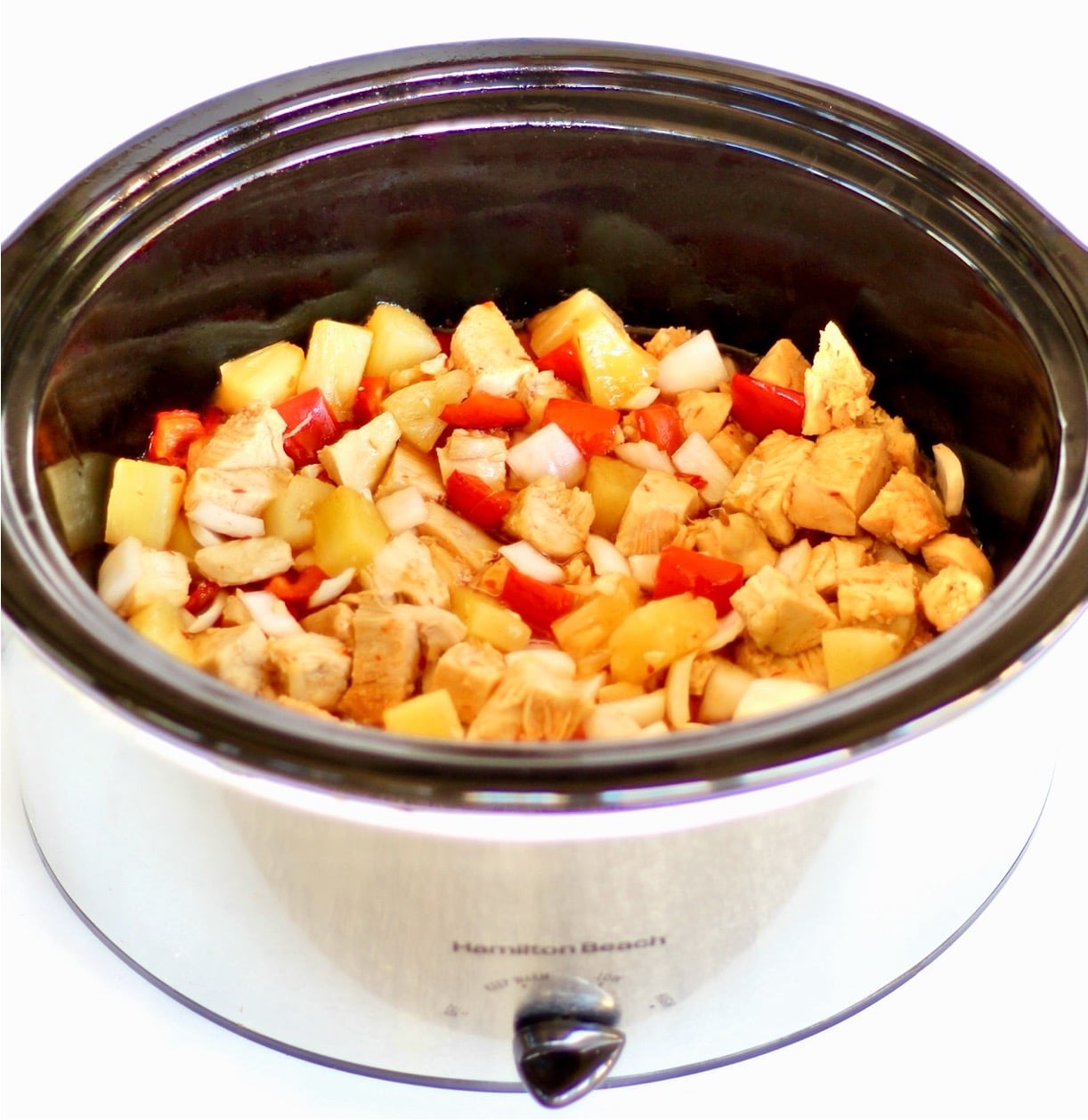 3. Add the sauce, pineapple, onion, peppers to your crockpot.