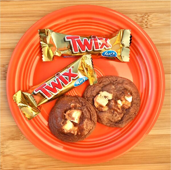 That’s what happens when you create soft chocolate cookies loaded up with heavenly bits of a Twix candy bar.